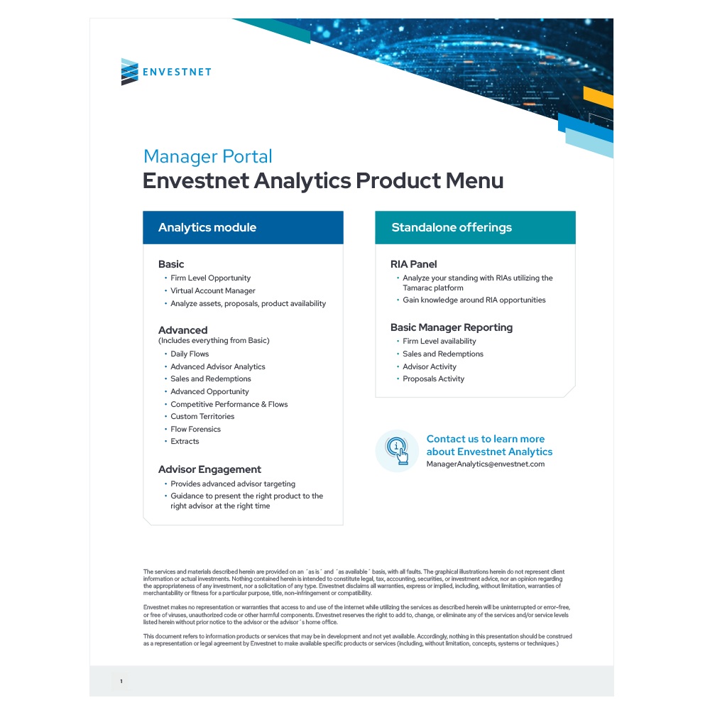 Get a snapshot of Envestnet Analytics and our powerful product menu. Unlock advanced insights to elevate your financial decisions.
