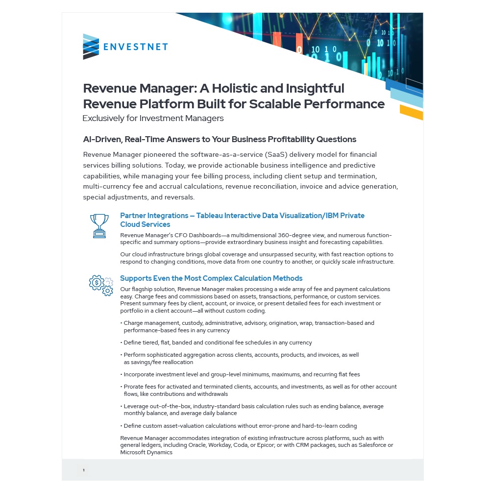 A holistic and insightful revenue platform built for scaleable performance for investment managers. Revenue Manager pioneered the software-as-a-service (SaaS) delivery model for financial services billing solutions.