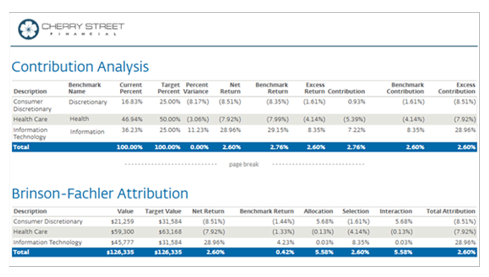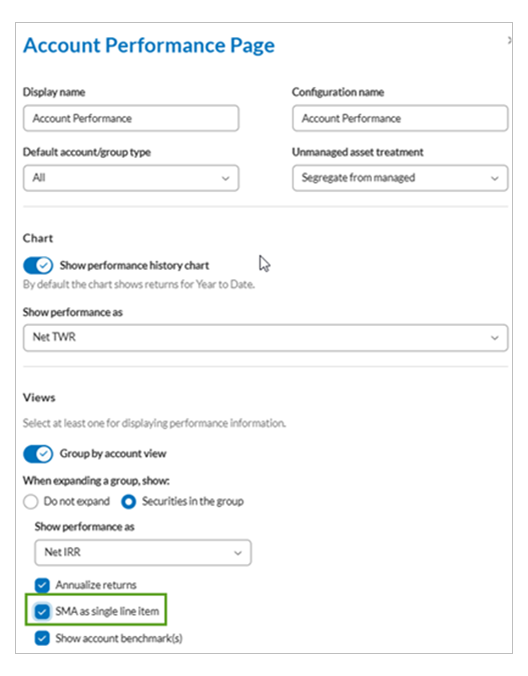 The Account Performance report is a cornerstone of your reporting to clients. If you use separately managed accounts (SMAs) though, you may not want to show every underlying SMA holding. To help you simplify the Account Performance report as needed, you can now display separately managed account holdings as a single aggregated line item.
