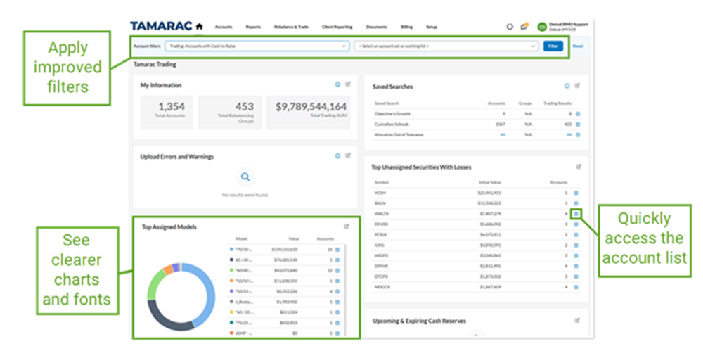 The remodeled Tamarac Trading Dashboard gives you a comprehensive, intuitive overview of events and account details—including trading AUM, cash reserves, security details, and models—all in one place. It’s designed to bring clarity and efficiency to the start of your trading day, helping you focus on the information that matters most.