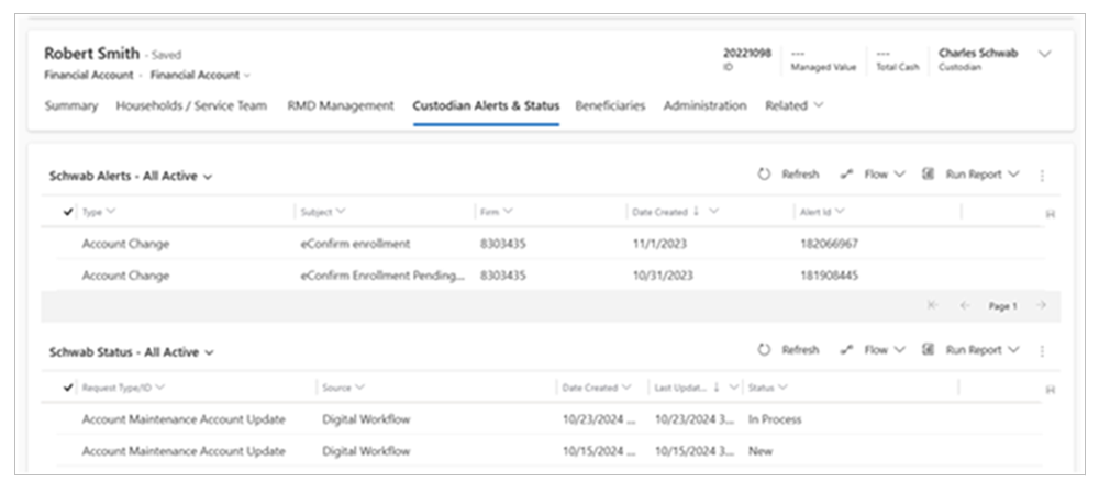 To preserve the alert audit trail in CRM, historical alerts synced from Schwab remain available on the Custodian Alerts & Status tab of a financial account for 18 months. Any updates to alerts in Schwab Advisor Center will not sync to CRM after the 30-day window. For more information and steps to enable this integration feature, see Schwab alerts and statuses in CRM.