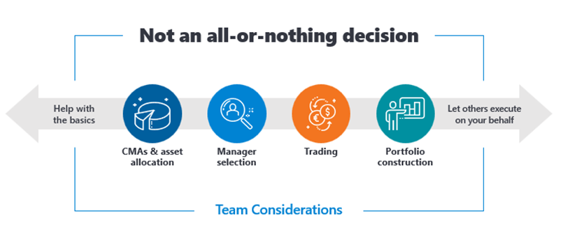 If a team-based approach sounds intriguing but you’re unsure of where to begin, there are four key areas to look at when delegating investment management: CMAs and asset allocation, manager research and selection, trading, and portfolio construction. Think of these as a spectrum of solutions and consider where it makes sense to supplement your own talents and the skills of your team to strengthen your practice.