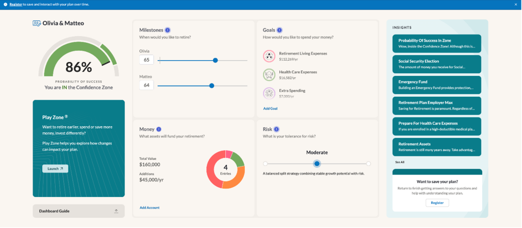 Dash jumpstarts planning discussions between advisors and prospects, without the friction that typically slows them down. Prospects only need to enter essential details such as name, state, age, gender, and employment income for a seamless setup. Clients already using MoneyGuide enjoy automatic pre-filled profiles.