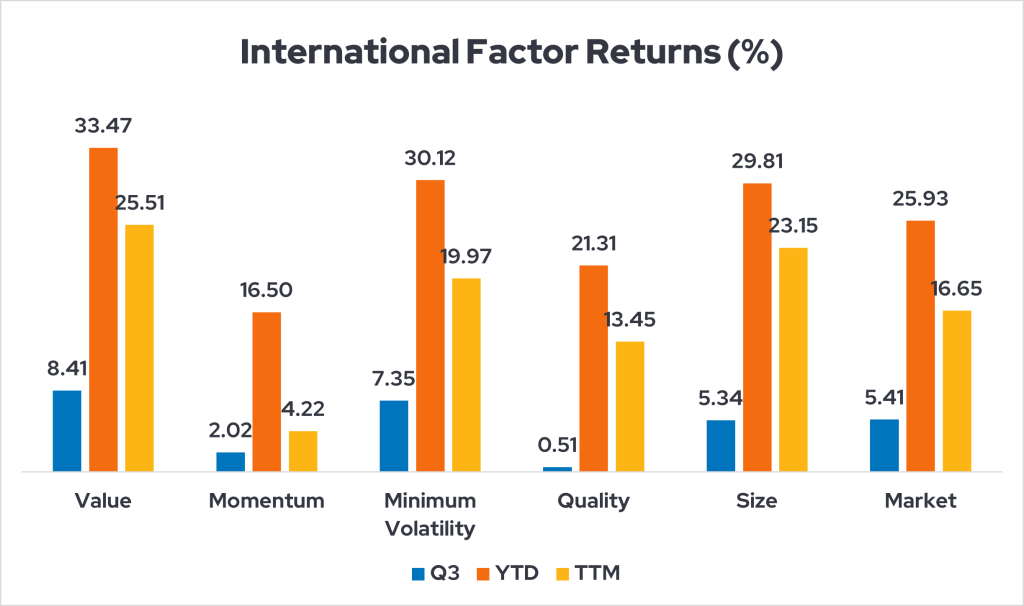 - The Value factor enjoyed strong returns in Q3 outside the U.S., which gave it leading YTD and TTM performance, too.